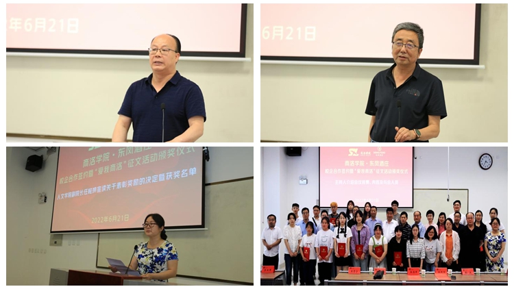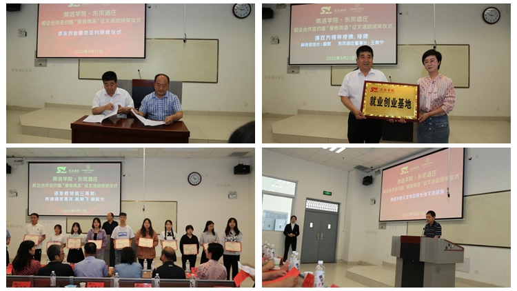 6月21日,人文學(xué)院與陜西東鳳酒莊有限公司共同舉辦校企合作簽約儀式暨“愛我商洛”征文活動(dòng)頒獎(jiǎng)活動(dòng)?!渡搪迦請?bào)社》總編輯南書堂、商洛市作協(xié)主席魚在洋、丹鳳縣政府教育督導(dǎo)室主任白寬虎、丹鳳縣科技統(tǒng)籌中心主任李書軍、丹鳳縣委黨校副校長程毅飛、商洛學(xué)院科技處處長程敏、商洛學(xué)院教務(wù)處副處長李會榮、陜西東鳳酒莊有限公司總經(jīng)理王青寧、商洛學(xué)院人文學(xué)院全體黨政領(lǐng)導(dǎo)出席。征文活動(dòng)獲獎(jiǎng)?wù)吆蜕搪鍖W(xué)院人文學(xué)院師生代表共一百余人參加了活動(dòng)?;顒?dòng)由人文學(xué)院副院長馬英群主持。