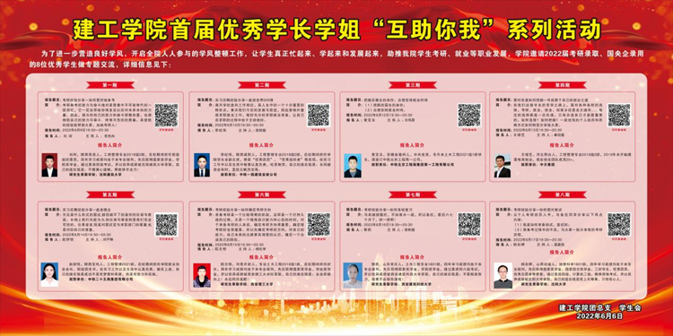 為進(jìn)一步落實(shí)學(xué)院學(xué)風(fēng)整頓計(jì)劃,營造良好的傳幫帶學(xué)習(xí)氛圍,助推學(xué)生考研、就業(yè)等持續(xù)良性發(fā)展,6月9日至17日,建工學(xué)院依托學(xué)知論壇,舉辦首屆優(yōu)秀學(xué)長(zhǎng)學(xué)姐“互助你我”系列講座。本次系列講座共有8場(chǎng),邀請(qǐng)來自工程管理、土木工程等專業(yè)的8位2022屆優(yōu)秀畢業(yè)生,通過線上線下相結(jié)合的方式分享了自己的考研、就業(yè)與創(chuàng)業(yè)經(jīng)驗(yàn)。