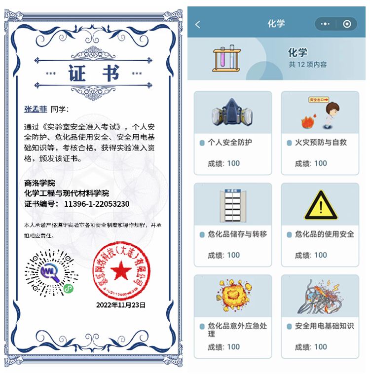活動內(nèi)容主要為慕樂網(wǎng)絡開發(fā)的虛擬實驗室安全知識考核,包括個人安全防護、火災預防與自救、高溫低溫操作安全、玻璃器材使用安全、危化品儲存與轉(zhuǎn)移、危化品的使用安全、氣瓶使用安全、廢棄物的安全處理與管控、?;芬馔鈶碧幚怼踩秒娀A(chǔ)知識、高壓釜使用安全、化工原理等實驗室相關(guān)安全知識。學生以趣味通關(guān)的方式完成考核,闖關(guān)成功后即獲得實驗室安全考核合格證書。