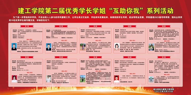 為扎實推進(jìn)“學(xué)生活動富起來 學(xué)習(xí)任務(wù)重起來 教風(fēng)學(xué)風(fēng)嚴(yán)起來”,充分發(fā)揮優(yōu)秀畢業(yè)生傳幫帶作用,6月19日至27日,城鄉(xiāng)規(guī)劃與建筑工程學(xué)院開展第二屆優(yōu)秀學(xué)長學(xué)姐“互助你我”系列活動,遴選2023屆考研錄取、國央企錄用的優(yōu)秀畢業(yè)生為2020級全體學(xué)生、2021級部分學(xué)生做專題交流。