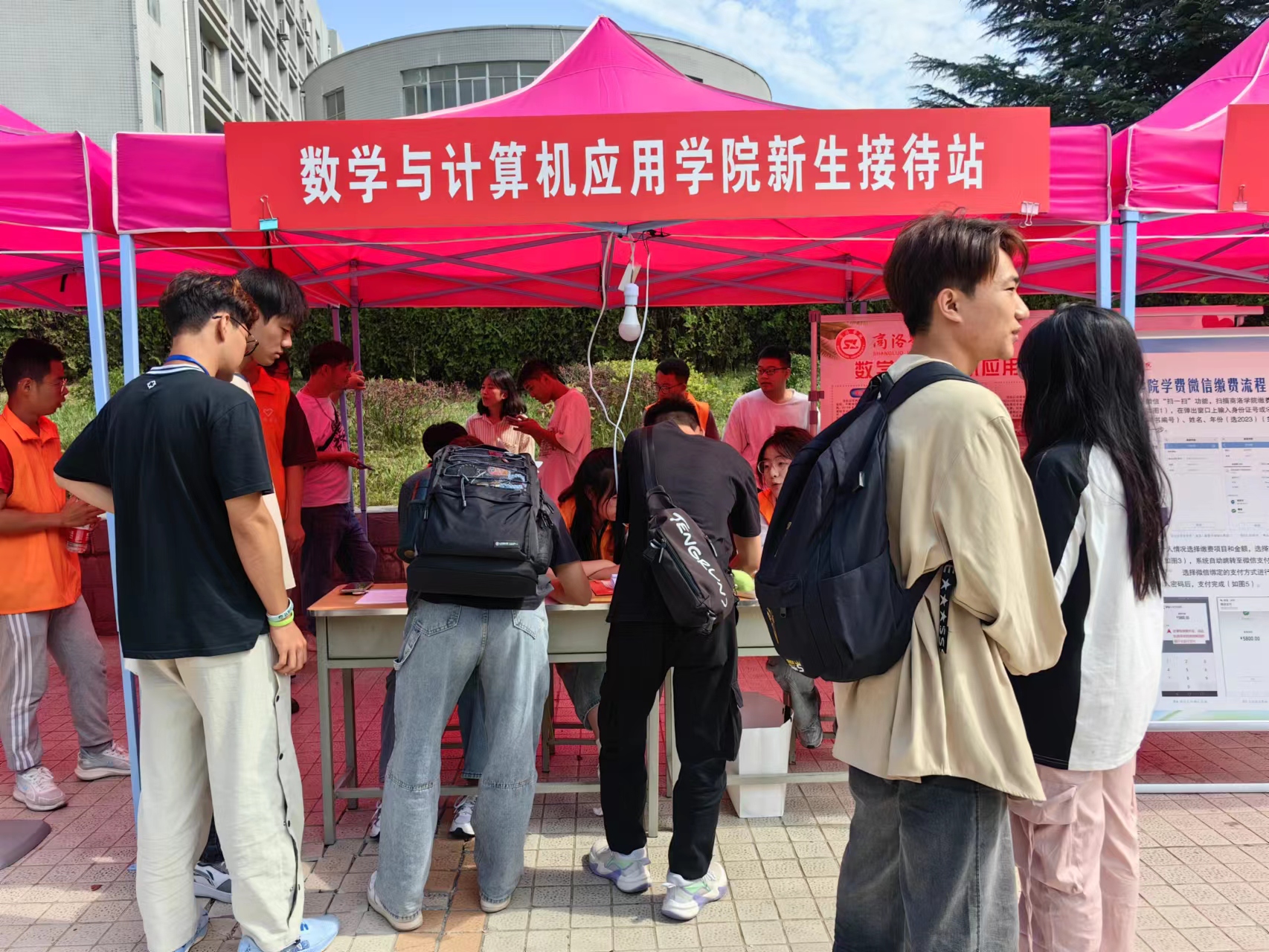 團(tuán)建聚力,熱情接待。院團(tuán)總支接到學(xué)院黨委部署后及時(shí)召開團(tuán)總支委員會(huì)會(huì)議,商定迎新具體安排。新生報(bào)到前,在8號(hào)樓及田徑場(chǎng)外圍懸掛迎新橫幅,在報(bào)到點(diǎn)安置院情展板,營(yíng)造濃烈迎新氛圍;新生報(bào)到期間,身著橙色馬甲的數(shù)計(jì)學(xué)院志愿者們有序引導(dǎo)新生辦理報(bào)到手續(xù),幫助他們搬運(yùn)行李、安排住宿并耐心地介紹校情院況,讓新生們感受到了來自學(xué)長(zhǎng)學(xué)姐們的熱情和愛護(hù)。