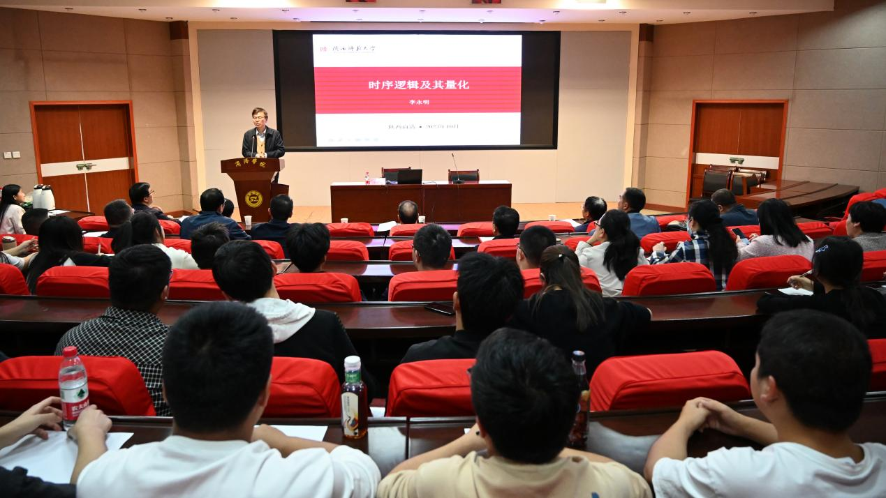 10月13日,數(shù)計學院邀請我??妥淌?、陜西師范大學博士生導師李永明教授來校作題為《時序邏輯及其量化》的學術(shù)報告。學院全體教師及80余名學生代表參加了報告會。報告會由數(shù)計學院副院長李會榮主持。