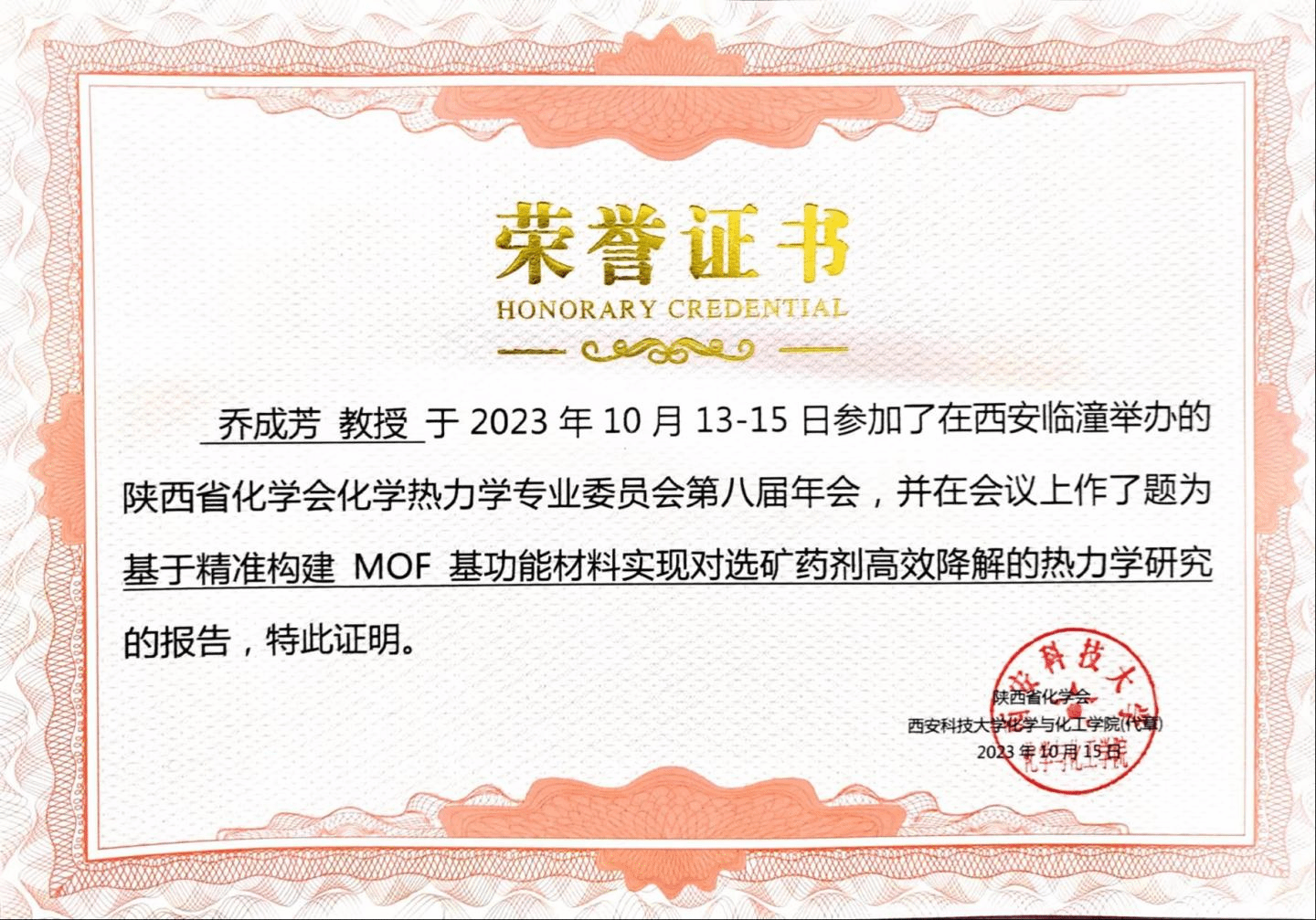 化材學(xué)院副院長喬成芳教授作了題為“基于精準(zhǔn)構(gòu)建 MOF 基功能材料實現(xiàn)對選礦藥劑高效降解的熱力學(xué)研究”的大會報告,分享了“MOF基功能材料熱化學(xué)”團隊在尾礦庫區(qū)廢水中金屬離子的檢測、選礦藥劑的高效降解的相關(guān)工作,并與參會專家進行交流。