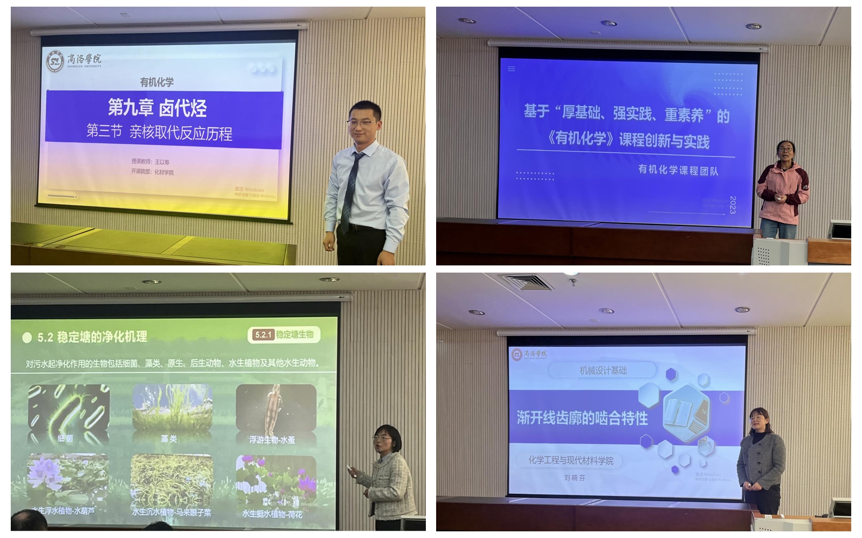 商洛學(xué)院青年教師教學(xué)技能競賽一等獎獲得者徐珊、商洛學(xué)院課程思政教學(xué)標兵劉曉芬、商洛學(xué)院課堂教學(xué)創(chuàng)新大賽一等獎王香婷、商洛學(xué)院青年教師教學(xué)技能競賽二等獎、課程思政教學(xué)骨干王以壽分別以《基于“厚基礎(chǔ)、強實踐、重素養(yǎng)”的<有機化學(xué)>課程創(chuàng)新與實踐》《穩(wěn)定化塘——凈化機理》《漸開線齒廓的嚙合特性》《親核取代反應(yīng)歷程》為題作了示范課講授,并分享了自身教學(xué)技巧和教學(xué)設(shè)計經(jīng)驗。