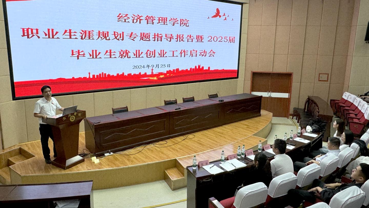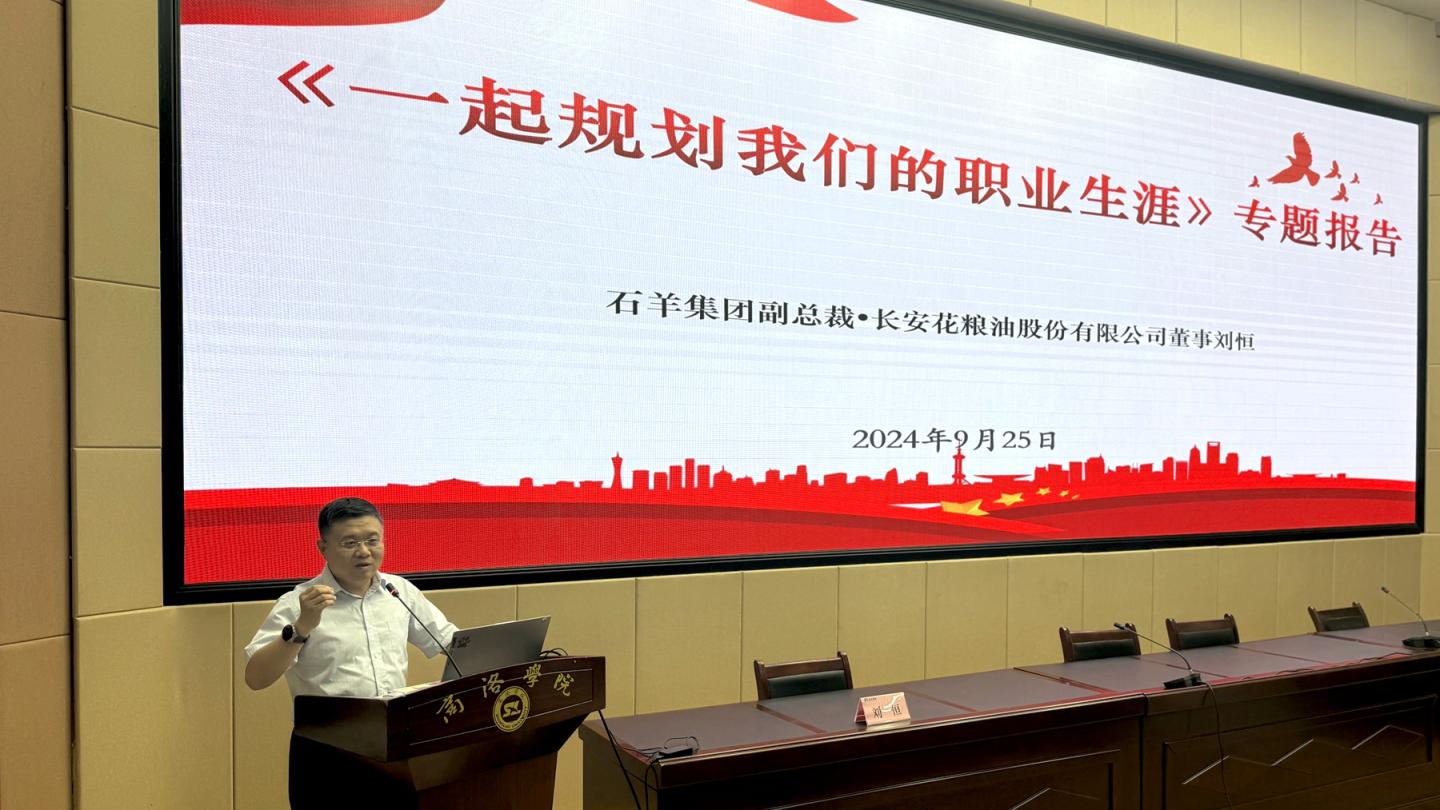 為引導(dǎo)2025屆畢業(yè)生正確認(rèn)識(shí)就業(yè)形勢(shì),推動(dòng)畢業(yè)生實(shí)現(xiàn)高質(zhì)量就業(yè),9月25日下午,經(jīng)濟(jì)管理學(xué)院舉辦職業(yè)生涯規(guī)劃專題指導(dǎo)報(bào)告暨2025屆畢業(yè)生就業(yè)創(chuàng)業(yè)工作啟動(dòng)會(huì)。石羊集團(tuán)副總裁、長(zhǎng)安花糧油股份有限公司董事劉恒,學(xué)院黨委副書記賈長(zhǎng)安,長(zhǎng)安花糧油股份有限公司相關(guān)人員以及經(jīng)管學(xué)院畢業(yè)班輔導(dǎo)員、全體2025屆畢業(yè)生參加會(huì)議。動(dòng)員會(huì)由賈長(zhǎng)安主持。
