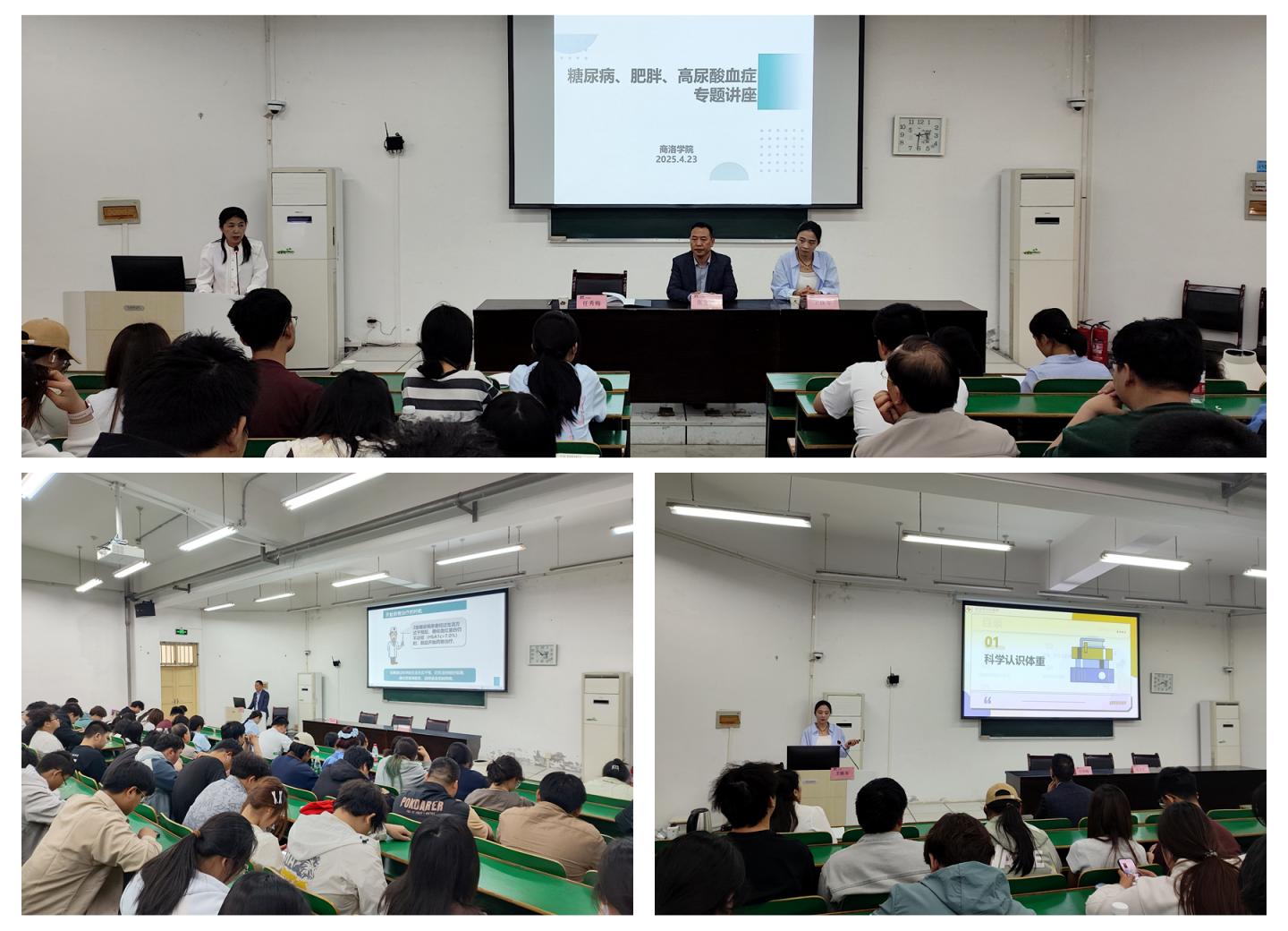 為關(guān)愛我校師生健康,進(jìn)一步普及疾病防治知識(shí),4月23日,商洛市中心醫(yī)院內(nèi)分泌科兼營養(yǎng)科主任張友杰主任醫(yī)師、營養(yǎng)科衛(wèi)姝岑醫(yī)師受邀為我校師生作糖尿病、肥胖、高尿酸血癥防治專題講座。校醫(yī)院全體醫(yī)務(wù)人員及近百名師生參加了本次講座,講座由校醫(yī)院院長任秀梅主持。