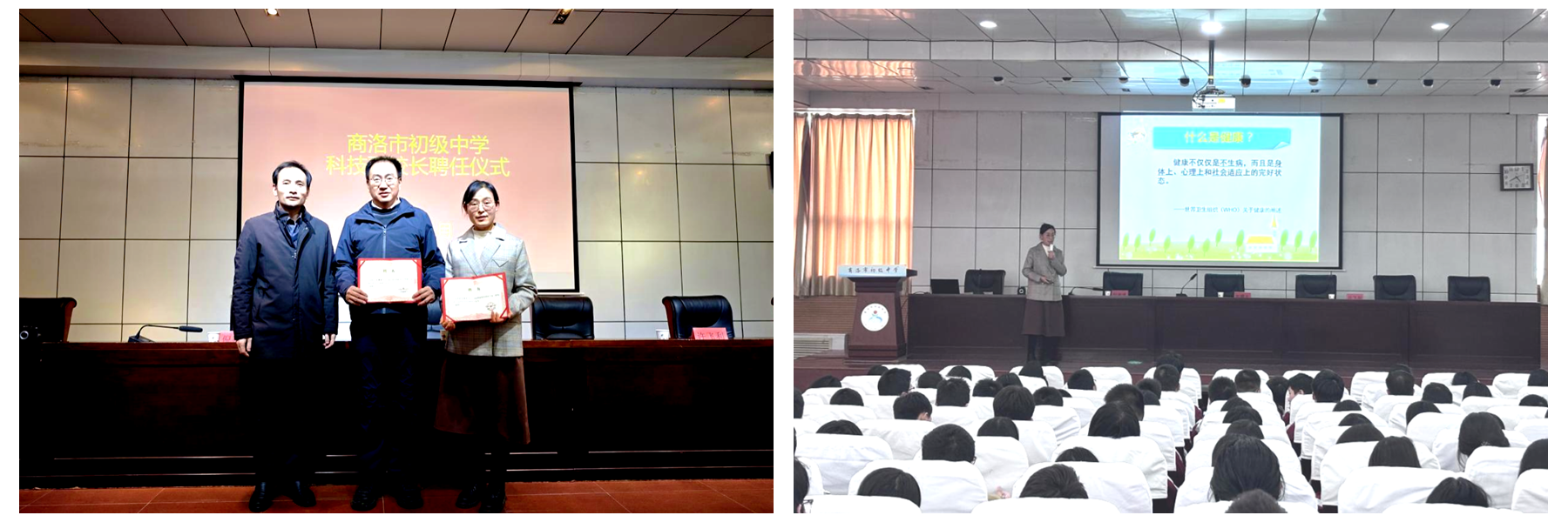 11月19日,應(yīng)商洛市初級(jí)中學(xué)邀請(qǐng),健康管理學(xué)院院長(zhǎng)郭耀東、公共衛(wèi)生系教師許飛利前往該校開展“科學(xué)管理體重,健康快樂成長(zhǎng)”主題教育培訓(xùn)。商洛市初級(jí)中學(xué)校長(zhǎng)倪德博出席活動(dòng),并在現(xiàn)場(chǎng)聘任郭耀東為學(xué)??萍几毙iL(zhǎng)、許飛利為健康教育指導(dǎo)專家。